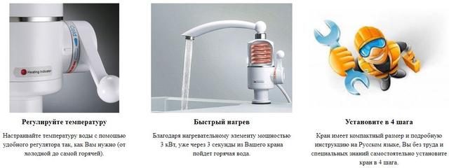 Прилад дасть можливість у будь-який час користуватися гарячою водою на кухні або ванній. Проточний водонагрівач досить встановити замість крана і підключити до мережі електроживлення і через кілька секунд з крана вже піде гаряча вода. Електричний водонагрівач підігріває воду з допомогою вбудованого терморегулятора.